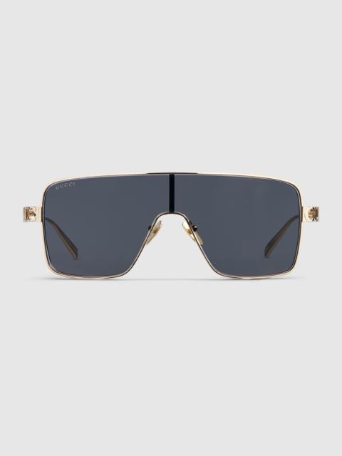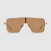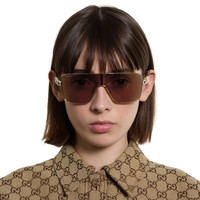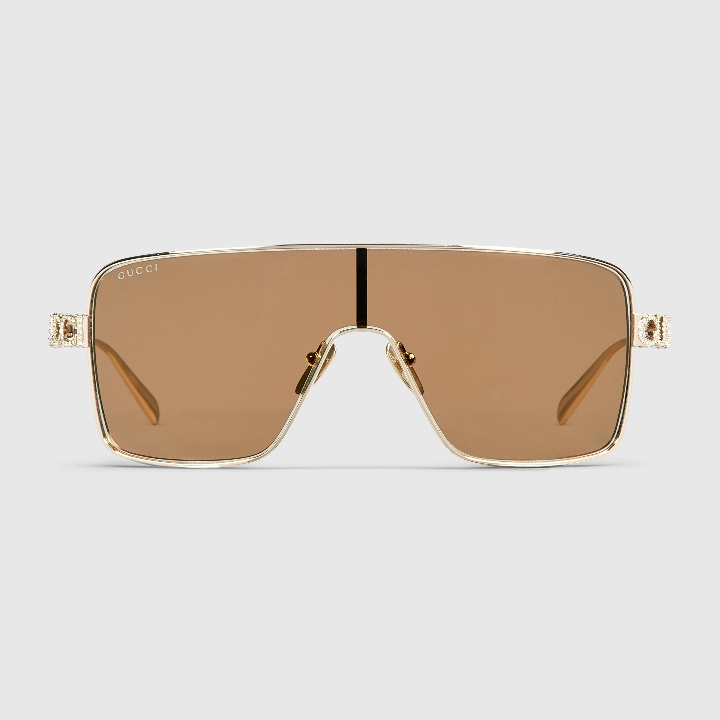 The Pre-Fall 2025 eyewear collection blends statement silhouettes from the archives with a contemporary touch. These rectangular frame sunglasses are stated in light gold-toned metal with a crystal cut-out Gucci logo detail. - Shiny light gold-toned metal frames - Shiny light gold-toned metal temples with crystal cut-out Gucci logo - Solid brown lens - 100% UVA/UVB protection - GG1936S - Temple length: 4.7"; Lens height: 2", Nose bridge length: 0.3" - Frame height: 2"; Frame width: 5"; Hinge to hinge: 5.4" - The glasses will arrive in a velvet case, available in a range of six jewel-toned colors and paired with a coordinating satin lining. The case color will be individually selected for each pair of glasses and comes with a matching satin flannel pouch and ivory microfiber cloth.