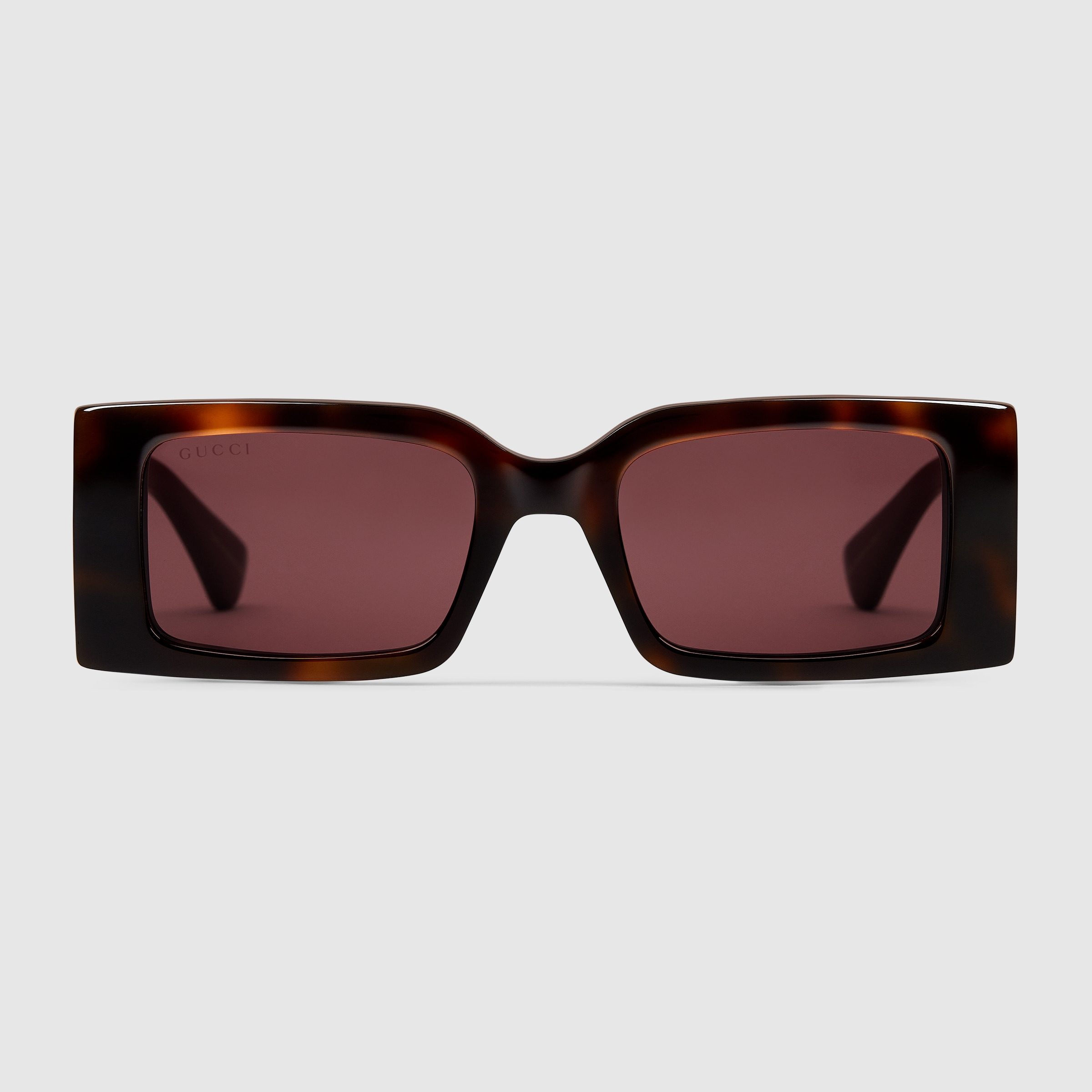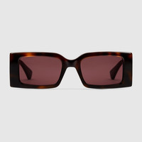 The Cruise 2025 eyewear collection blends a bold silhouette and signature motifs in a contemporary design. These rectangular sunglasses with green and red temples feature a Gucci logo. - Brown tortoiseshell acetate - Shiny blue and red injection temples with Gucci logo - Solid burgundy lens - 100% UVA/UVB protection - GG1860S - Temple length: 13.5cm; Lens height: 3.6cm; Nose bridge length: 2cm - Frame height: 4.3cm; Frame width: 14.4cm; Hinge to hinge: 12.9cm - Made in Japan - The eyewear case in the House’s signature Gucci Rosso Ancora red hue is complete with a magnetic closure and white interior.