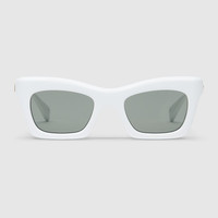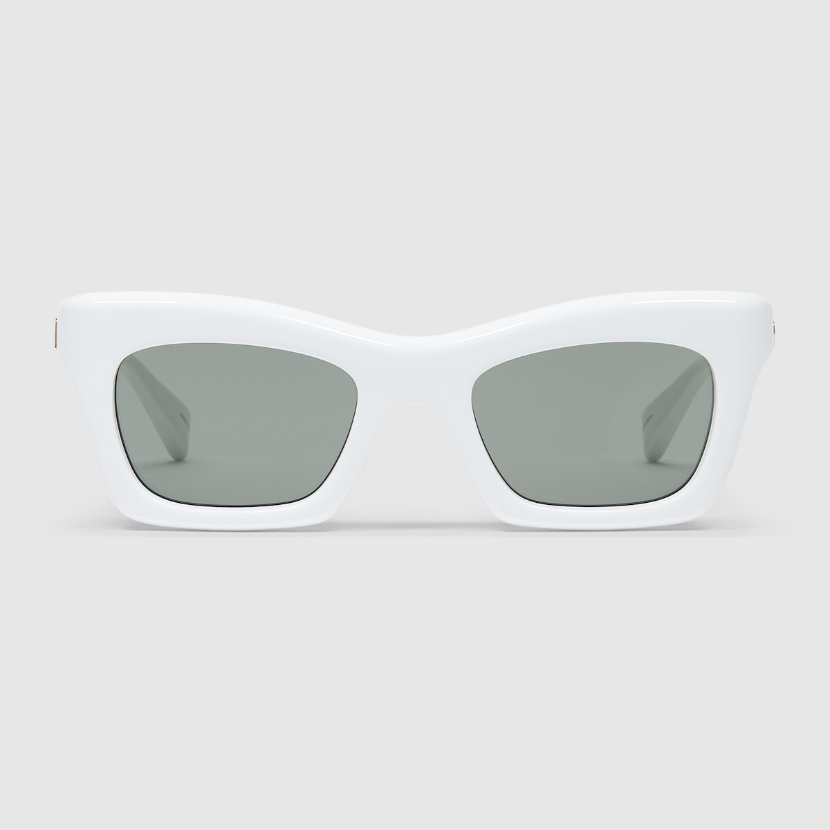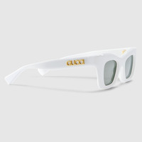 Inspired by the summer spirit and beach clubs on the Italian coast, this item is part of Gucci Lido. This pair of white sunglasses is crafted in shiny acetate. The rectangular-shaped frame is enhanced by a gold-toned Gucci script detail on the temples, while the solid grey lenses complete the style. - Shiny white acetate frame - Shiny white acetate temples with gold-toned Gucci script - Solid grey lens - 100% UVA/UVB protection - Frame height: 1.7"; Frame width: 5.7" - GG1773S - Temple length: 5.5"; Lens height: 1.4", Nose bridge length: 0.8" - Made in Italy - The Rosso Ancora packaging, a distinctive color chosen by Creative Director Sabato De Sarno to mark the beginning of Gucci's new creative chapter, includes a vinyl case and satin pouch.