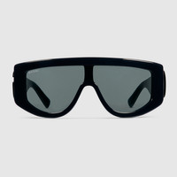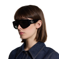 The Pre-Fall 2025 eyewear collection successfully combines the coveted silhouettes of bygone decades with a contemporary logo feel. Here, a black acetate frame pairs with a Double G detail. - Shiny black acetate frames - Shiny black acetate temples with Double G detail - Solid grey lens - 100% UVA/UVB protection - GG1950S - Temple length: 5.1"; Lens height: 1.8" - Frame height: 1.8"; Frame width: 5.6"; Hinge to hinge: 5.1" - The glasses will arrive in a velvet case, available in a range of six jewel-toned colors and paired with a coordinating satin lining. The case color will be individually selected for each pair of glasses and comes with a matching satin flannel pouch and ivory microfiber cloth.