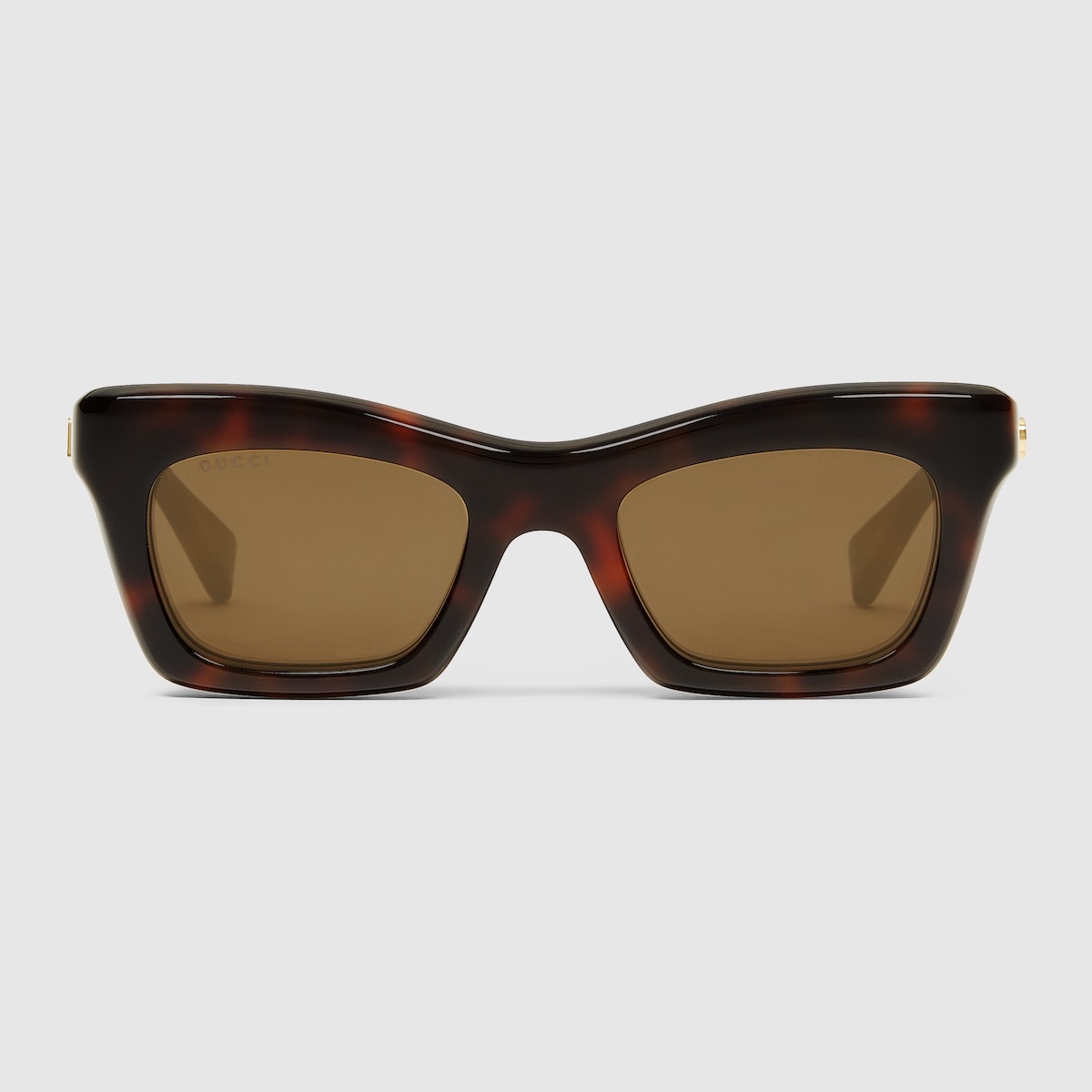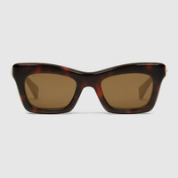 Inspired by the summer spirit and beach clubs on the Italian coast, this item is part of Gucci Lido. This pair of tortoiseshell sunglasses is crafted in shiny acetate. The rectangular-shaped frame is enhanced by a gold-toned Gucci script detail on the temples, while the solid brown lenses complete the style. - Shiny tortoiseshell acetate frame - Shiny tortoiseshell acetate temples with gold-toned Gucci script - Solid brown lens - 100% UVA/UVB protection - Frame height: 1.7"; Frame width: 5.7" - GG1773S - Temple length: 5.5"; Lens height: 1.4", Nose bridge length: 0.8" - Made in Italy - The Rosso Ancora packaging, a distinctive color chosen by Creative Director Sabato De Sarno to mark the beginning of Gucci's new creative chapter, includes a vinyl case and satin pouch.