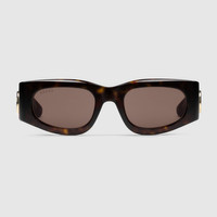 The Pre-Fall 2024 eyewear collection successfully combines the coveted silhouettes of bygone decades with a contemporary logo feel. Here, a shiny dark tortoiseshell acetate frame pairs with double layered acetate temples and an Interlocking G motif. - Shiny dark tortoiseshell acetate frames - Shiny double layered red and purple acetate temples with Interlocking G - Solid brown lens - 100% UVA/UVB protection - GG1664S - Temple length: 5.5"; Lens height: 1.3", Nose bridge length: 0.8" - Made in Italy - The Rosso Ancora packaging, a distinctive color chosen by Creative Director Sabato De Sarno to mark the beginning of Gucci's new creative chapter, includes a vinyl case and satin pouch. - Frame height: 1.7"; Frame width: 5.6"