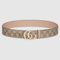 The GG Marmont collection introduces a reversible option for the new season. Crafted from GG Supreme and leather, this belt is defined by the signature Double G buckle. - Beige and dark brown soft GG Supreme on one side, pink leather on the other - Light gold-toned hardware - Double G buckle - 1.5" width - Can be worn as a hip or waist belt. Sizing will differ based on where the belt is worn, please refer to the size guide to find your size.