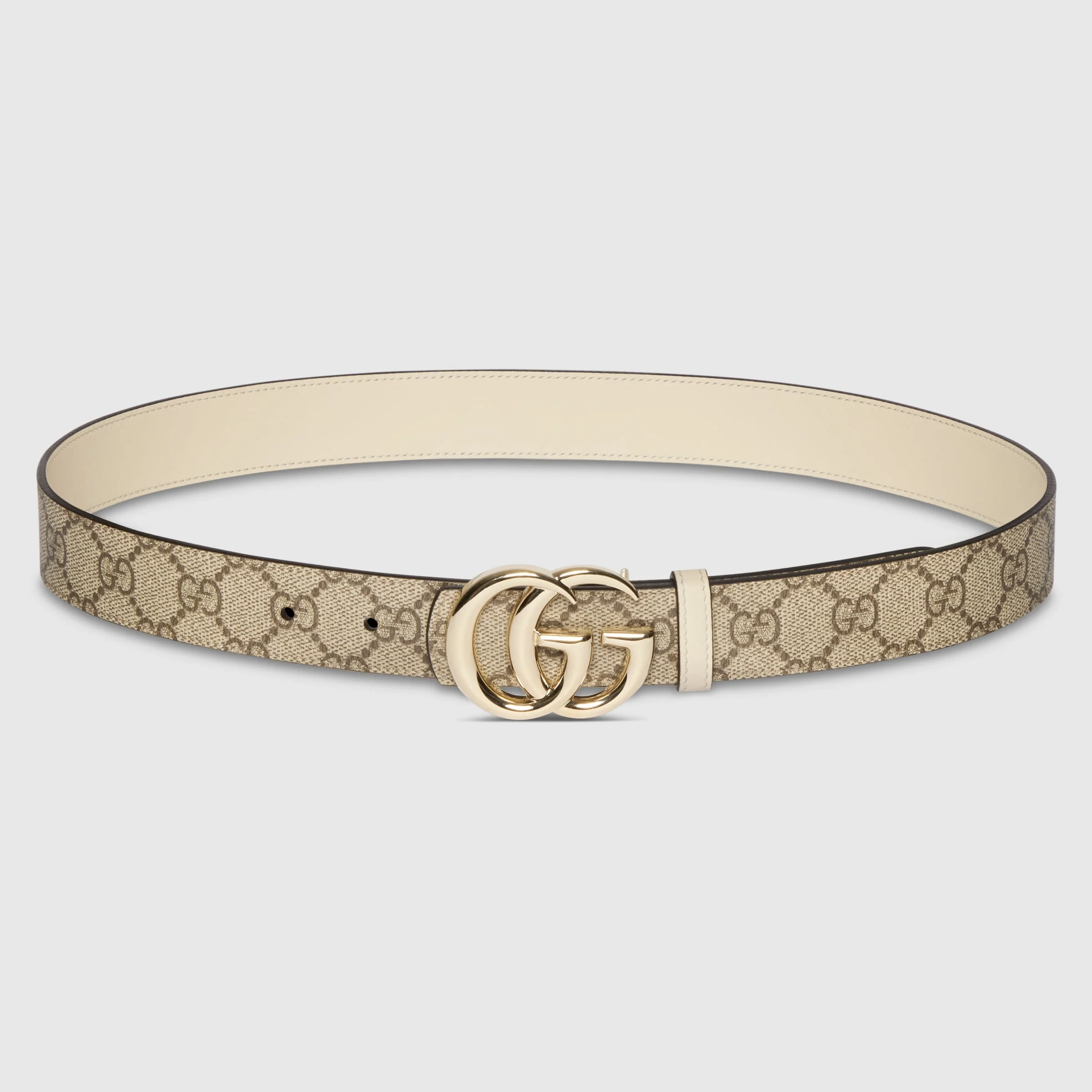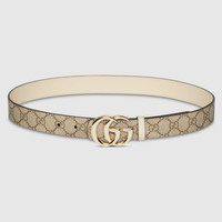 The GG Marmont collection introduces a reversible option for the new season. Crafted from GG Supreme and leather, this belt is defined by the signature Double G buckle. - Beige and dark brown soft GG Supreme on one side, ivory leather on the other - Light gold-toned hardware - Double G buckle - 1.1" width - Can be worn as a hip or waist belt. Sizing will differ based on where the belt is worn, please refer to the size guide to find your size.