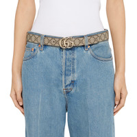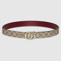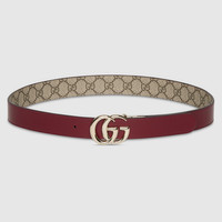 This reversible belt is presented as part of the Pre-Fall 2025 collection. Taking inspiration from the heritage of the House, it's crafted from a GG Supreme and leather. A light gold-toned Double G buckle completes the piece. - Beige and dark brown GG Supreme on the one side, Gucci Rosso Ancora leather on the other - Light gold-toned hardware - Double G buckle - 1.2" width - Made in Italy - Can be worn as a hip belt. Sizing will differ based on where the belt is worn, please refer to the size guide to find your size.