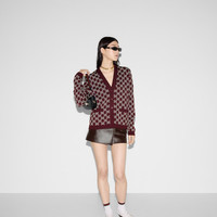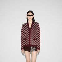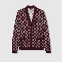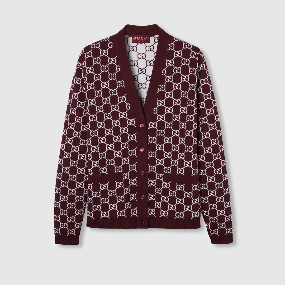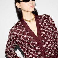 The GG motif appears in unexpected colors and fabric combinations, from linen blend to nylon. This reversible V-neck cardigan has been crafted from a GG fine wool jacquard, revealing an inverse color palette on the reverse. - Bordeaux and white GG fine wool jacquard on the one side - White and bordeaux GG fine wool jacquard on the other - V-neck - Dropped shoulder - Long sleeves - Two front pockets - Contrast rib trim - Shoulder drop: 16.1 " based on a size S (IT) - Sleeves Length: 24.0 " based on a size S (IT) - Button closure - Regular fit - Length: 25.9 " based on a size S (IT) - Made in Italy - The product shown in this image is a size small (IT)