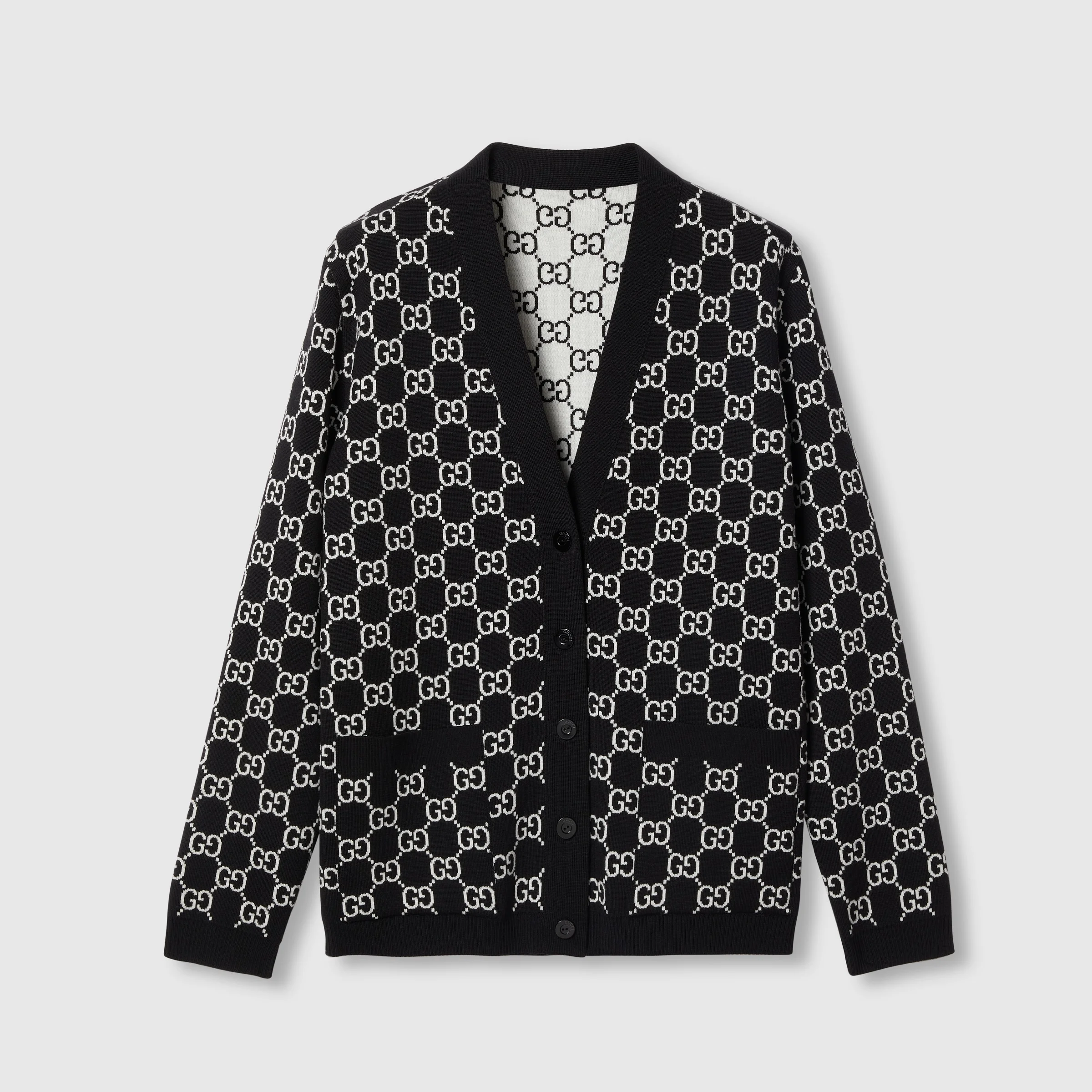 Taking inspiration from founder Guccio Gucci's monogram, the GG motif continues to be a firm favorite of the House. This reversible cardigan is stated in a fine wool tubular GG jacquard stitch and completed with a contrast rib trim. - Black and white reversible fine wool tubular GG jacquard stitch - V-neck - Dropped shoulder - Long sleeves - Two front pockets - Contrast rib trim - Shoulder drop: 16.1 " based on a size S (IT) - Sleeves Length: 24.0 " based on a size S (IT) - Button closure - Regular fit - Length: 25.9 " based on a size S (IT) - Made in Italy - The model is 5'9" and is wearing size small