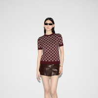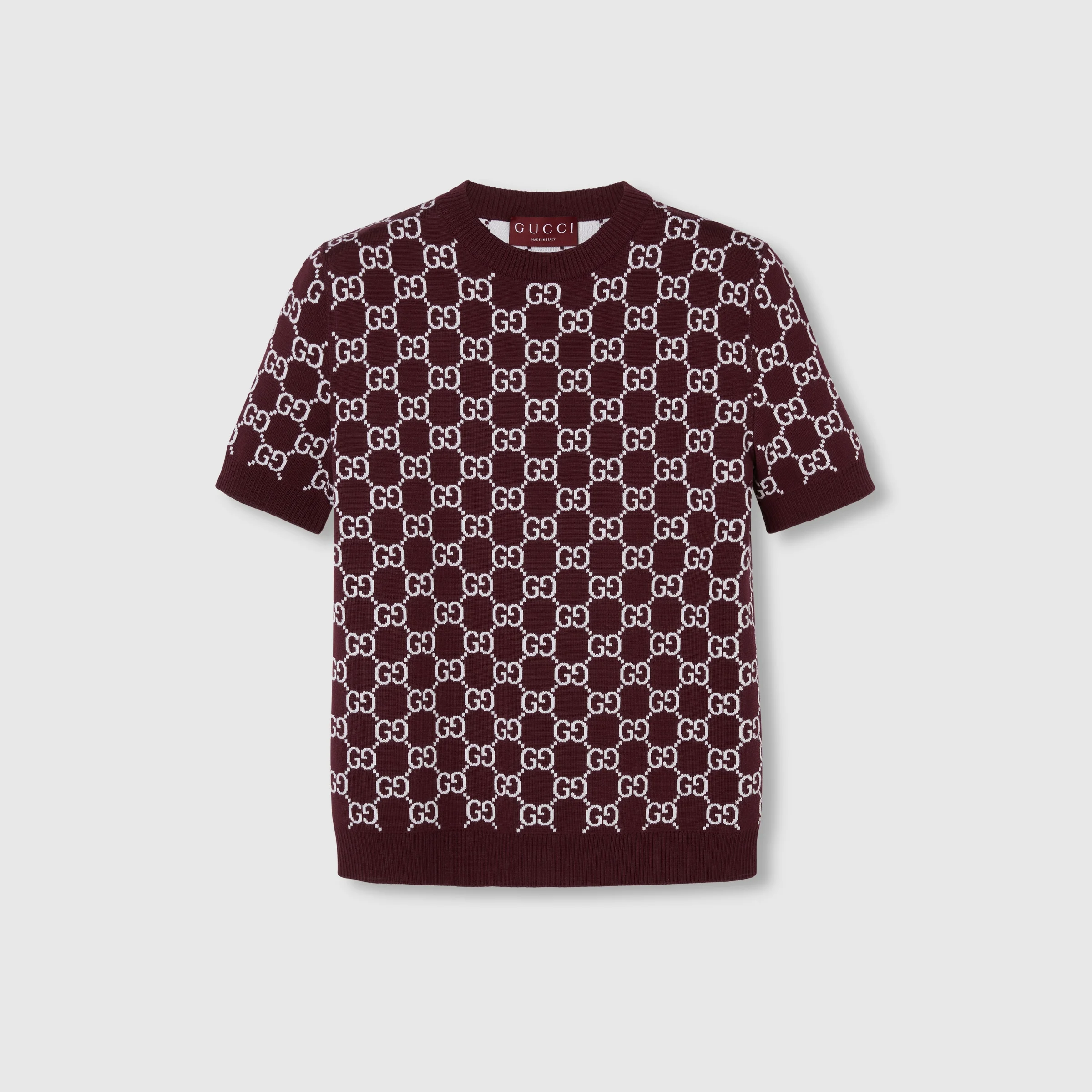 The GG motif appears in unexpected colors and fabric combinations, from linen blend to nylon. This reversible crewneck top has been crafted from a GG fine wool jacquard, revealing an inverse color palette on the reverse. - Bordeaux and white GG fine wool jacquard on the one side - White and bordeaux GG fine wool jacquard on the other - Crewneck - Short sleeves - Rib trim - Shoulder drop: 15.9 " based on a size S (IT) - Sleeves Length: 8.85 " based on a size S (IT) - Slim fit - Length: 23.6 " based on a size S (IT) - Made in Italy - The product shown in this image is a size small (IT)