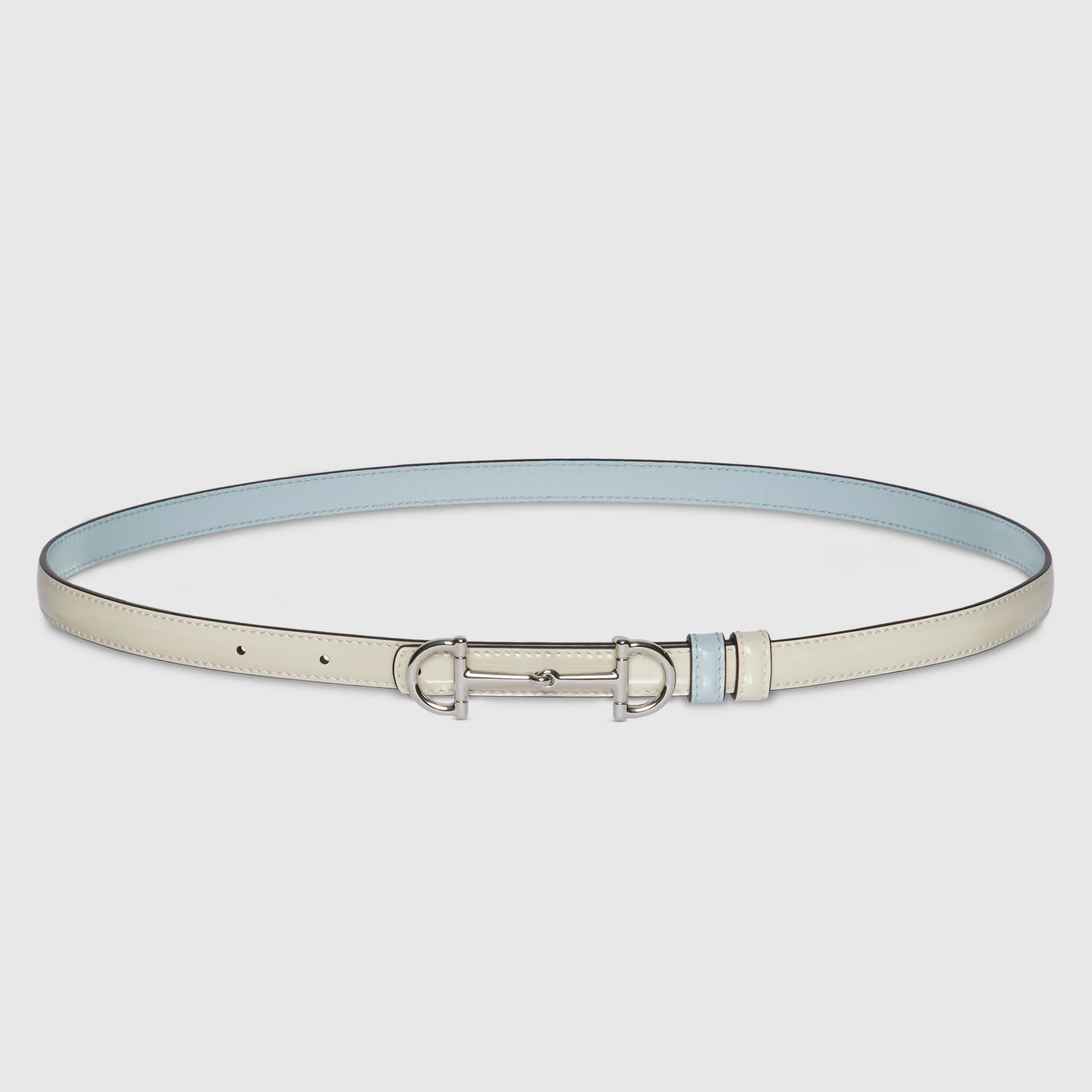The Horsebit is one of the House's most loved emblems, highlighting its equestrian heritage. This reversible thin belt is stated in shiny leather and smooth leather with a palladium-toned Horsebit buckle. - White shiny leather on one side, light blue smooth leather on the other - Palladium-toned hardware - Horsebit buckle - 0.6" width - Can be worn as a hip belt. Sizing will differ based on where the belt is worn, please refer to the size guide to find your size.
