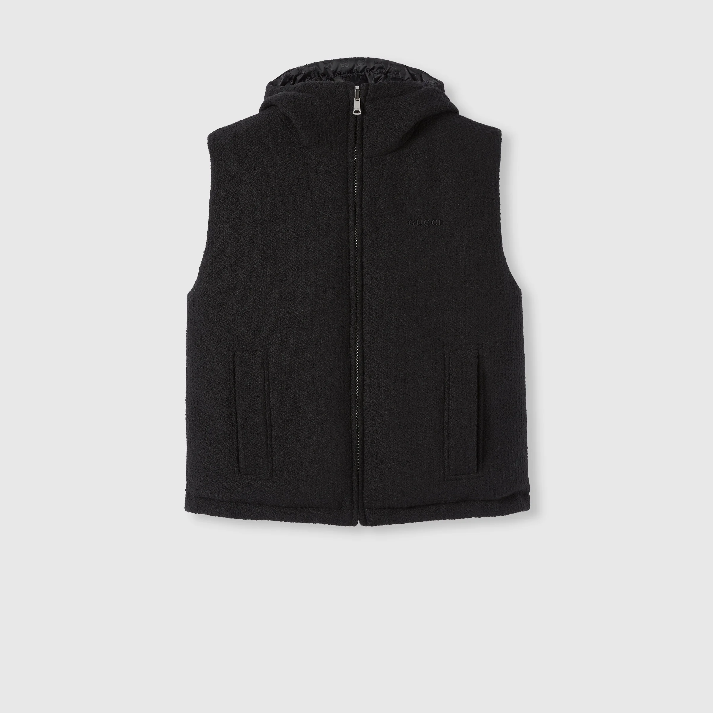 The Pre-fall 2025 collection introduces a new take on warm materials on sophisticated outerwear pieces, in traditional and contemporary silhouettes. This gilet in wool boucle is reversible to GG nylon on the other side. - Black wool boucle on one side - GG motif on nylon on the other side - Reversible - Padded - Fixed hood - Sleeveless - Two side pockets - Drawstring hem - Zip closure - Made in Italy - Fabric: 93% Wool, 7% Polyamide - Lining: 100% Polyamide - Padding (fiber): 100% Polyester