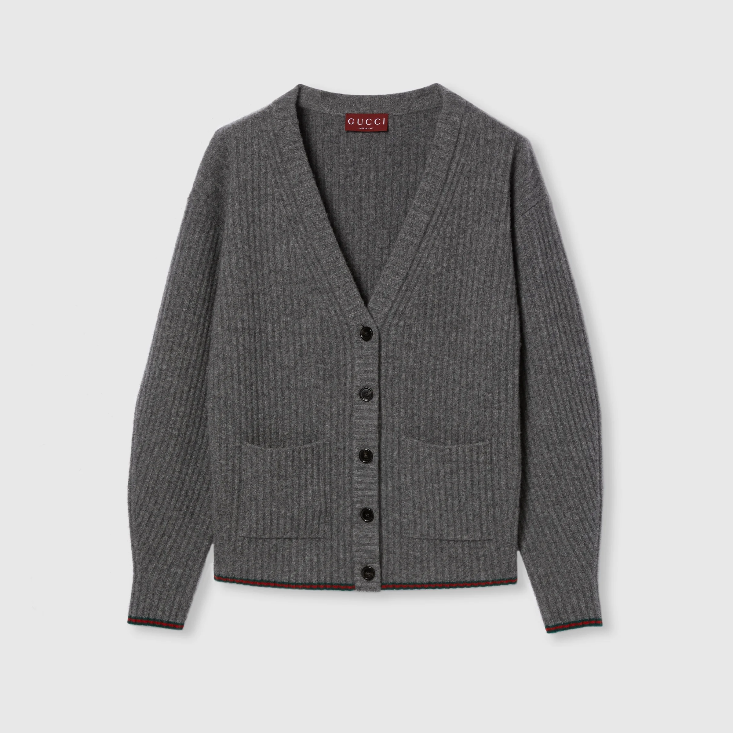 The Pre-fall 2025 collection introduces a new take on warm materials on sophisticated leisure pieces, in traditional and contemporary silhouettes. This loose v-neck cardigan is crafted from a soft rib felted wool style and is complete with the archival Web trim. - Dark grey soft rib felted wool - Web trim - V-neck - Dropped shoulder - Two front pockets - Button closure - Made in Italy