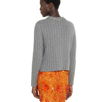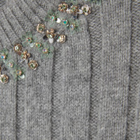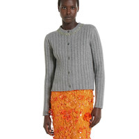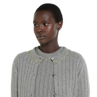 In the Fall Winter 2025 collection, tactile yarns and luminous accents elevate essential knitwear shapes. This cardigan is crafted in a ribbed knit and embellished with crystal embroidery along the neckline. - Grey wide rib soft wool and cashmere - Crystal embroidered collar - Crewneck - Long sleeves - Open front - Length: 21.7"; based on size S - Made in Italy