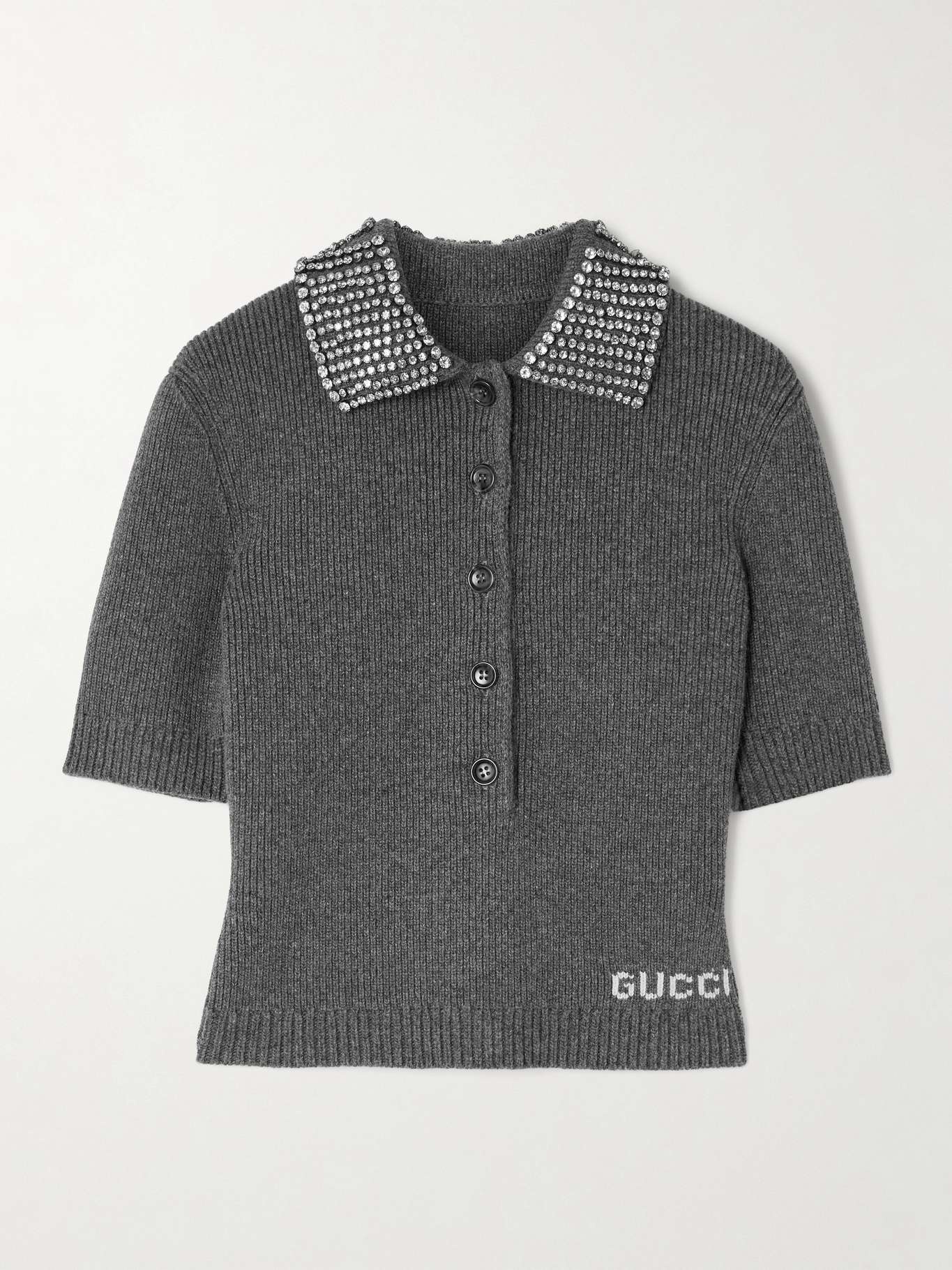 EDITORS'NOTES Creative Director Sabato De Sarno updates archival Gucci styles with unexpected embellishments for Fall '24 - this polo shirt is embellished with rows of glittering crystals along the collar. It's rib-knitted from warm wool and detailed with a jacquard logo just above the hem. Wear yours with the matching micro shorts from the collection. SIZE & FIT Model measurements: - Fits true to size, take your normal size - Designed for a slim fit - Mid-weight knit - Model is 180cm/ 5'11" and is wearing a size Small - Bust: 81cm/ 32" - Waist: 64cm/ 25" - Hip: 89cm/ 35" DETAILS & CARE - Gray and off-white wool - Button fastenings along front - 100% wool; buttons: 100% horn (Buffalo)