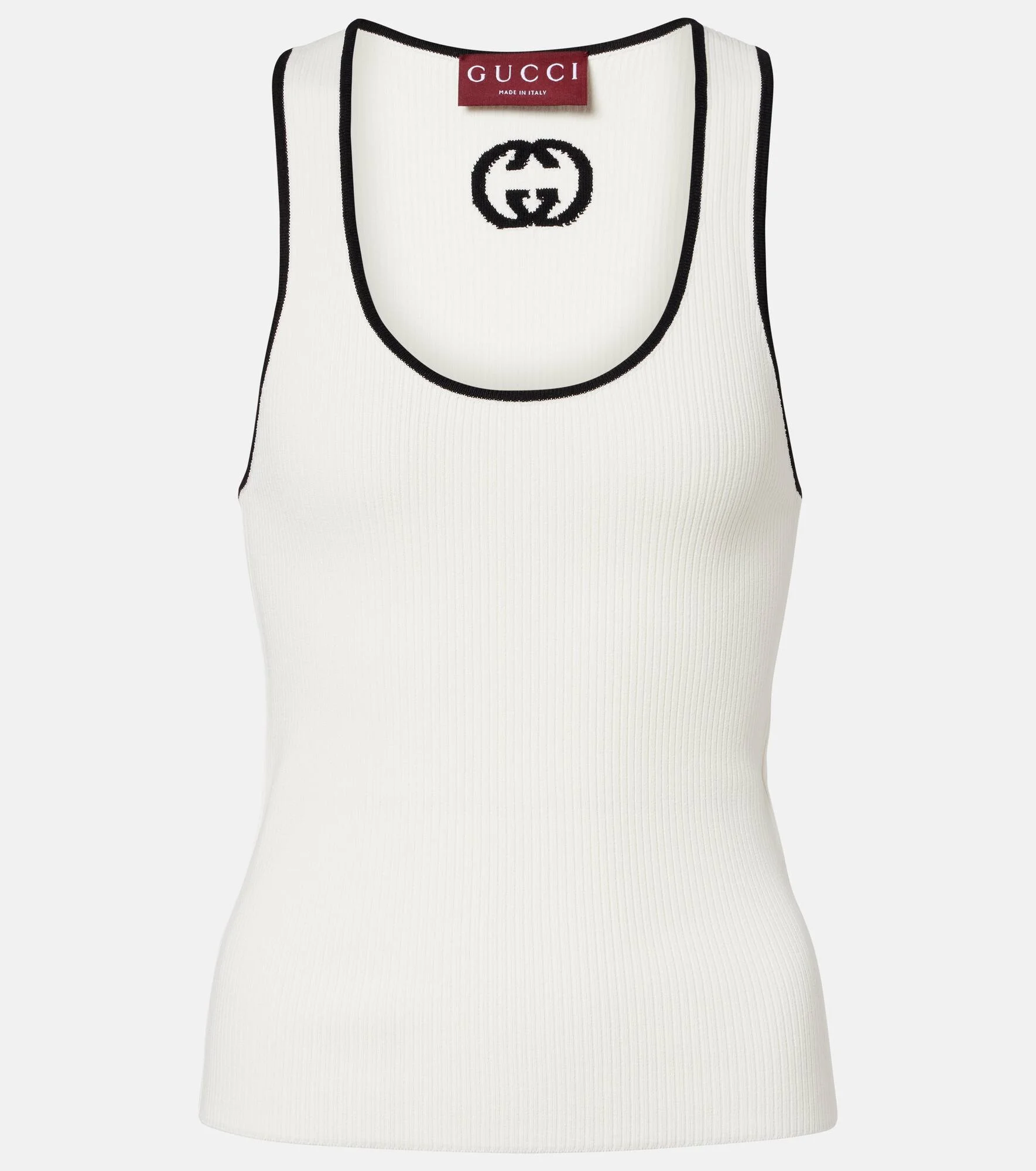 Defined by Gucci’s modern elegance, this white ribbed-knit tank top is crafted from a soft cotton-blend. Black contrast trims add definition, creating a sleek, contemporary silhouette that elevates everyday essentials. Product Details - Material: 83% viscose, 17% polyester - Care instructions: dry clean - Made in Italy - Color: white - Designer color name: Natural/Black - Item number: P01119168 Size & Fit - True to size - Fitted - Stretchy fabric - Falls to the hip - Height of model is 174cm-68.5" and wears a size XS