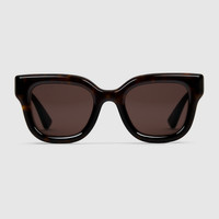 The Cruise 2025 eyewear collection blends a rounded silhouette and signature motifs in an inspired design. These sunglasses feature a well-proportioned frame and Double G detail on the temples. - Shiny dark brown tortoiseshell injection frame - Shiny dark brown tortoiseshell injection temples with Double G detail - Solid brown lens - 100% UVA/UVB protection - GG1828S - Temple length: 5.7"; Lens height: 1.6"; Nose bridge length: 0.9" - Frame height: 2"; Frame width: 5.6"; Hinge to hinge: 4.8" - Made in Italy - The eyewear case in the House’s signature Gucci Rosso Ancora red hue is complete with a magnetic closure and white interior.