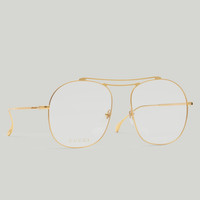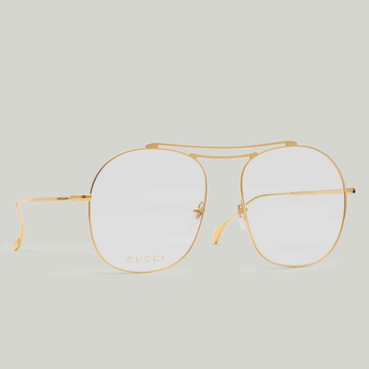 With a retro touch, a pared-down and gold-toned metal frame defines these optical glasses. The Gucci logo along the temples gives the accessory a subtle detail. - This product comes with a transparent sample lens to help the frames hold their shape. Please note that it is not intended for use, visit an opticians or specialized store for prescription lens fitting. - Yellow gold-toned metal - Shiny yellow gold-toned metal temples with Gucci logo detail - Demo lens - GG1479S - Frame height: 2.4"; Frame Width: 5.8" - Temple length: 5.7"; Lens height: 2.3", Nose bridge length: .7" - Made in Japan - Available exclusively on Gucci.com, your pair of optical frames will be delivered in a lightweight, soft case.