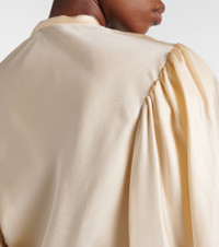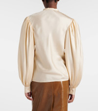 Gucci continues to redefine luxury and pursue its commitment to excellence and creativity. Italian-crafted from pure silk, this blouse is shaped with billow sleeves, a buttoned front, and elegantly ruffled neckline. Product Details - Material: 100% silk - Care instructions: dry clean - Made in Italy - Color: beige - Designer color name: Light Beige - Item color: beige - Interlining: 100% polyamide - Contains non-textile parts of animal origin - Collar: band - Closure: buttoned front - Cuff: buttoned - Item number: P01099034 Size & Fit - True to size - Oversized shoulders - Designed for a loose fit - Non-stretchy fabric - Falls below the hip - The model seen in the picture is 178cm-5'10" and wearing a size IT 40