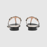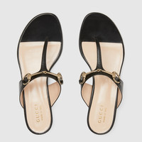 A perfect fusion of elegance and simplicity, the Gucci Women's Thong Sandal brings signature design to the warm-weather wardrobe. Crafted from luxurious leather, this sandal is adorned with the light gold-toned Horsebit—a signature detail that reflects Gucci’s timeless heritage. - Black leather - Women's - Light gold-toned hardware - Leather lining - Horsebit - Flat - Height: 0.5" - Made in Italy