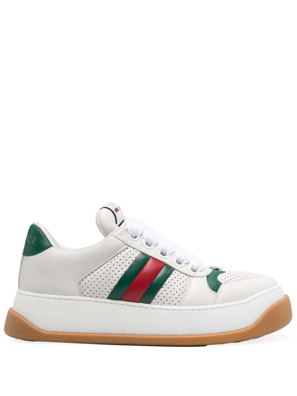 Screener sneakers Highlights - White/multicolour - Leather - Signature web detailing - Enamel detail - Round toe - Perforation detail at the toe - Logo patch at the tongue - Contrasting branded heel counter - Front lace-up fastening - Branded insole - Chunky rubber sole - Women's gucci sneakers fit large. for the most comfortable fit please select half a size down. Made in Italy Composition Leather 100% SIZE & FIT Measurement HEEL 1.96 in(5 cm) Sole height 1.57 in(4 cm)