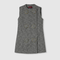 In the Fall Winter 2025 collection, a tailored approach defines this sleeveless dress. Designed with a crewneck and constructed like a long vest, it features oversized covered buttons along the front. - White and black seeded wool with a textured appearance - Fully lined - Crewneck - Sleeveless - Self-covered maxi snap buttons - Length: 33.5"; based on size 38 IT - Made in Italy