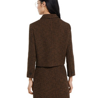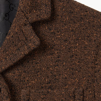 In the Fall Winter 2025 collection, utility codes are refined through precise cuts and compact proportions. This cropped jacket features a peak lapel, four front patch pockets with flaps and a button-up front. Half lined. - Dark brown and black seeded wool with a textured appearance - Gucci horn buttons - Half lined - Peak lapel - Four front patch pockets - Button closure - Length: 18.9"; based on size 38 IT - Made in Italy