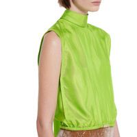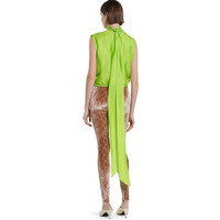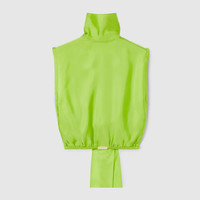 In the Fall Winter 2025 collection, this sleeveless top is crafted from bright green viscose twill. Designed with a floor-length self-tie neck bow, the style features a ruched elastic waist with a metal Gucci buckle and a covered button closure. - Bright green viscose twill - Unlined - Ruched elastic waist with metal Gucci buckle - Floor length self-tie neck bow - Sleeveless - Covered button closure - Length: 18.3"; Shoulder width: 15.4"; based on a size 38 (IT) - Made in Italy