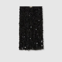In the Fall Winter 2025 collection, this skirt is enriched with embroidered motifs and a metal Gucci buckle at the waist. The style comes with a detachable lining and is completed by a back slit and zip closure. - Black wave embroidered lace - Sequin embroidery - Detachable lining - Ruched elastic waist with metal Gucci buckle - Back slit - Length: 23.6"; based on a size 38 (IT) - Made in Italy