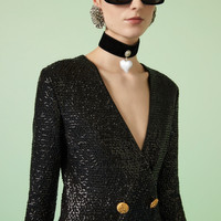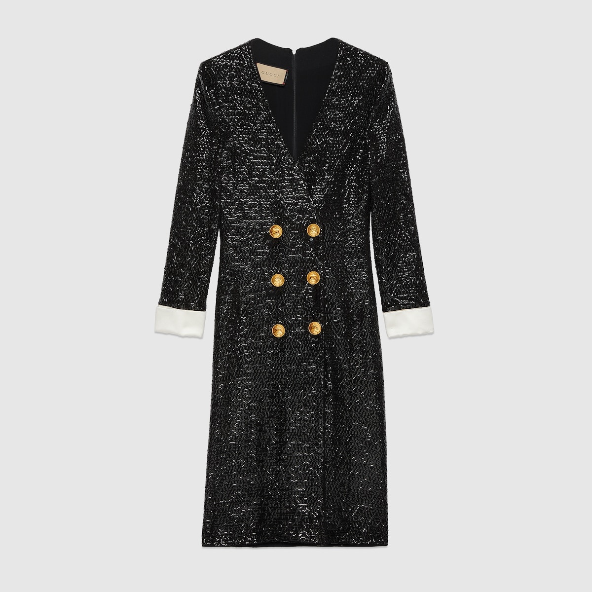 Essential pieces in the Pre-Fall 2023 collection are embellished with signature Gucci motifs for the wardrobe. This retro-inspired dress is presented in a black sequin-embroidered viscose and further enhanced with Interlocking G anchor gold-toned buttons and contrasting cuffs. - Black sequin-embroidered viscose - Interlocking G anchor gold-toned decorative buttons - Lined - V-neck - Double-breasted - Contrasting cuffs - Concealed zip closure - Length: 47.2" based on a size 40 (IT) - Made in Italy - The model is 5'7" and is wearing size 40 (IT)