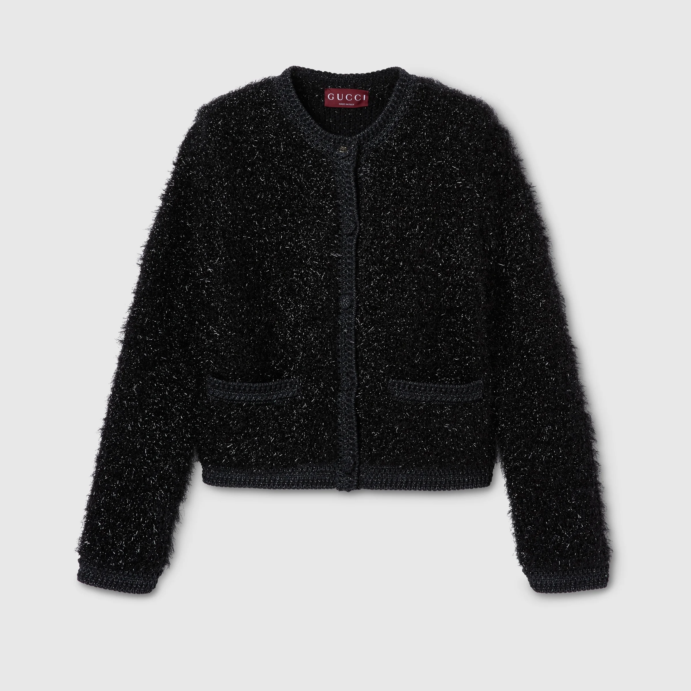 The Cruise 2026 women's ready-to-wear collection highlights sumptuous materials on essential silhouettes to usher in the festive season. Crafted from black shiny chunky wool, this cardigan is finished with an Interlocking G metal detail. - Black shiny chunky wool - Tonal braided trim - Interlocking G metal detail - Crewneck - Long sleeves - Front button closure - Length: 20", based on a size S