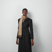 The House's heritage motifs shine through eye-catching prints. Presented in a soft wool, this square shawl features a shiny GG jacquard and is enriched with fringe edges. - Shiny brown and camel GG wool jacquard - Fringe edges - Brown trim - 55.1"W x 55.1"L - Made in Italy
