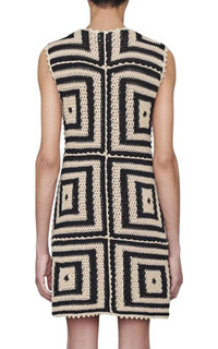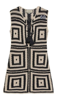 Crocheted designs bring softened texture and contrasting colors to the Pre-Fall 2020 collection. This short dress has a dropped neckline with self-tie and recalls styles from the late '60s and early '70s, and the blue and ivory crochet panels are sewn together by hand for an intarsia effect. - Blue and ivory crochet cotton panels sewn together by hand - Dropped neckline with self-tie - Sleeveless - Length: 29.5" based on a size small - 100% cotton - Made in Italy - The model is 5'9". The product shown in this image is a size small