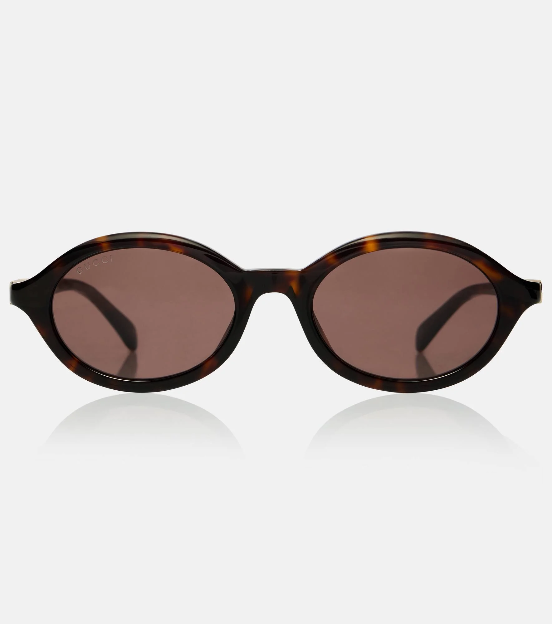 The Signoria sunglasses from Gucci feature an elegant oval silhouette in a brown-hued pattern. The pair is crafted with a sleek acetate frame and embellished with gold-tone logo lettering at the temples. Product Details - Frame material: acetate - Frame color: brown - Lens filter category 3 - Color: brown - Lens color: brown - Made in Japan - Includes: case, cleaning cloth - The color of the case may vary - Item number: P01144380 Size & Fit - Lens width: 51mm-2" - Bridge size: 19mm-0.75" - Earpiece length: 140mm-5.5"