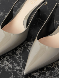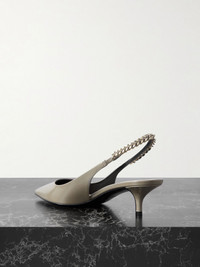 The Gucci Signoria pump, named after the central piazza of Florence, recalls the classic elegance of the House’s founding city. With its shiny patent leather, pointed toe and eye-catching Gucci chain, this slingback style elevates the everyday wardrobe for the coming season. - Light grey patent leather - Women's - Pointed toe - Gucci chain, stitched by hand - Leather sole - Elastic slingback closure - Low heel - 1.7" heel height, based on a size 37 (IT) - Made in Italy