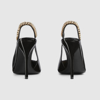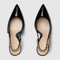 The Gucci Signoria pump, named after the central piazza of Florence, recalls the classic elegance of the House’s founding city. With its shiny patent leather, pointed toe and eye-catching Gucci chain, this slingback style elevates the everyday wardrobe for the coming season. - Black patent leather - Women's - Pointed toe - Gucci chain, stitched by hand - Leather sole - Elastic slingback closure - High heel - 4.1" heel height, based on a size 37 (IT) - Made in Italy