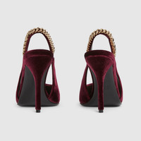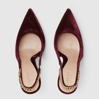 The Gucci Signoria pump, named after the central piazza of Florence, recalls the classic elegance of the House’s founding city. With smooth velvet, pointed toe and eye-catching Gucci chain, this slingback style elevates the everyday wardrobe for the coming season. - Bordeaux velvet - Leather lining - Gucci chain, stitched by hand - Leather sole - Elastic slingback closure - High heel - Height: 4.1" - Made in Italy