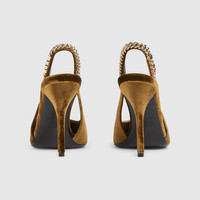 The Gucci Signoria pump, named after the central piazza of Florence, recalls the classic elegance of the House’s founding city. With smooth velvet, pointed toe and eye-catching Gucci chain, this slingback style elevates the everyday wardrobe for the coming season. - Brown velvet - Leather lining - Gucci chain, stitched by hand - Leather sole - Elastic slingback closure - High heel - Height: 4.1" - Made in Italy