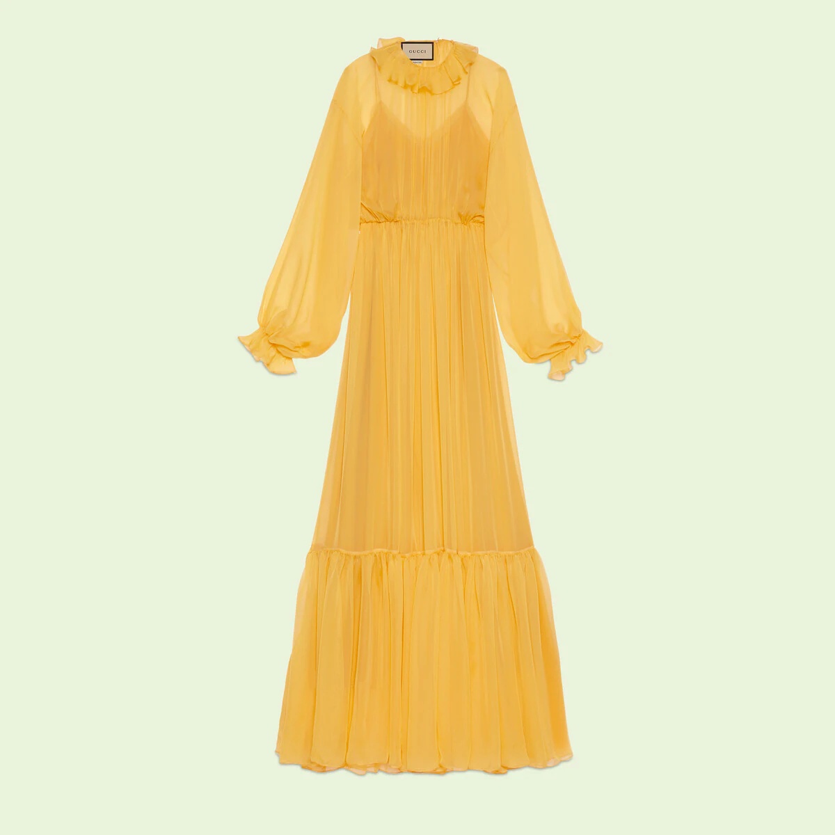 With a long-standing tradition rooted in the jet set, The House continues to pay homage to Hollywood divas. Dramatic silhouettes appear throughout the collection, highlighting Gucci glamour aesthetic. This dress is crafted from yellow silk chiffon. - Yellow silk chiffon - Detachable camisole - Ruffle neck - Long sleeves - Elastic waistband - Button closure - Length: 66.9", based on a size 40 (IT) - Made in Italy - The product shown in this image is a size 40 (IT)