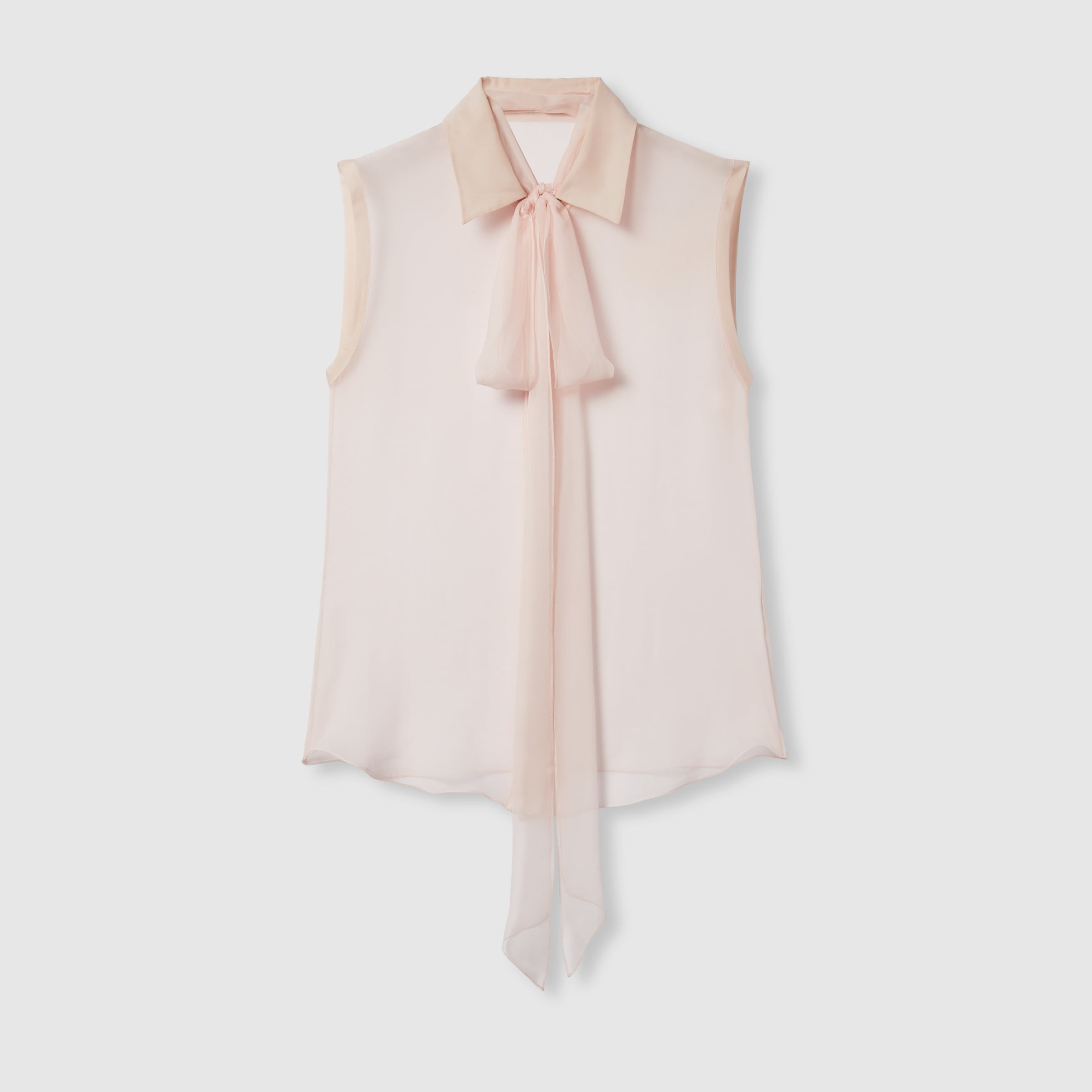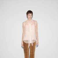 Presented at the Gucci Cruise 2025 women's runway show in London, this sleeveless shirt crafted from multicolor silk chiffon is infused with a sense of romance, blending delicate floral pattern and sophisticated lightweight material. - Multicolor silk chiffon - Floral print - Point collar - Self-tie neck bow - Sleeveless - Detachable camisole - Button closure - Total length: 25.0"; Shoulder: 14.6"; Neck width: 15.4"; based on a size 38 IT - Made in Italy