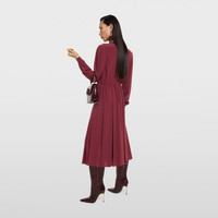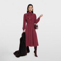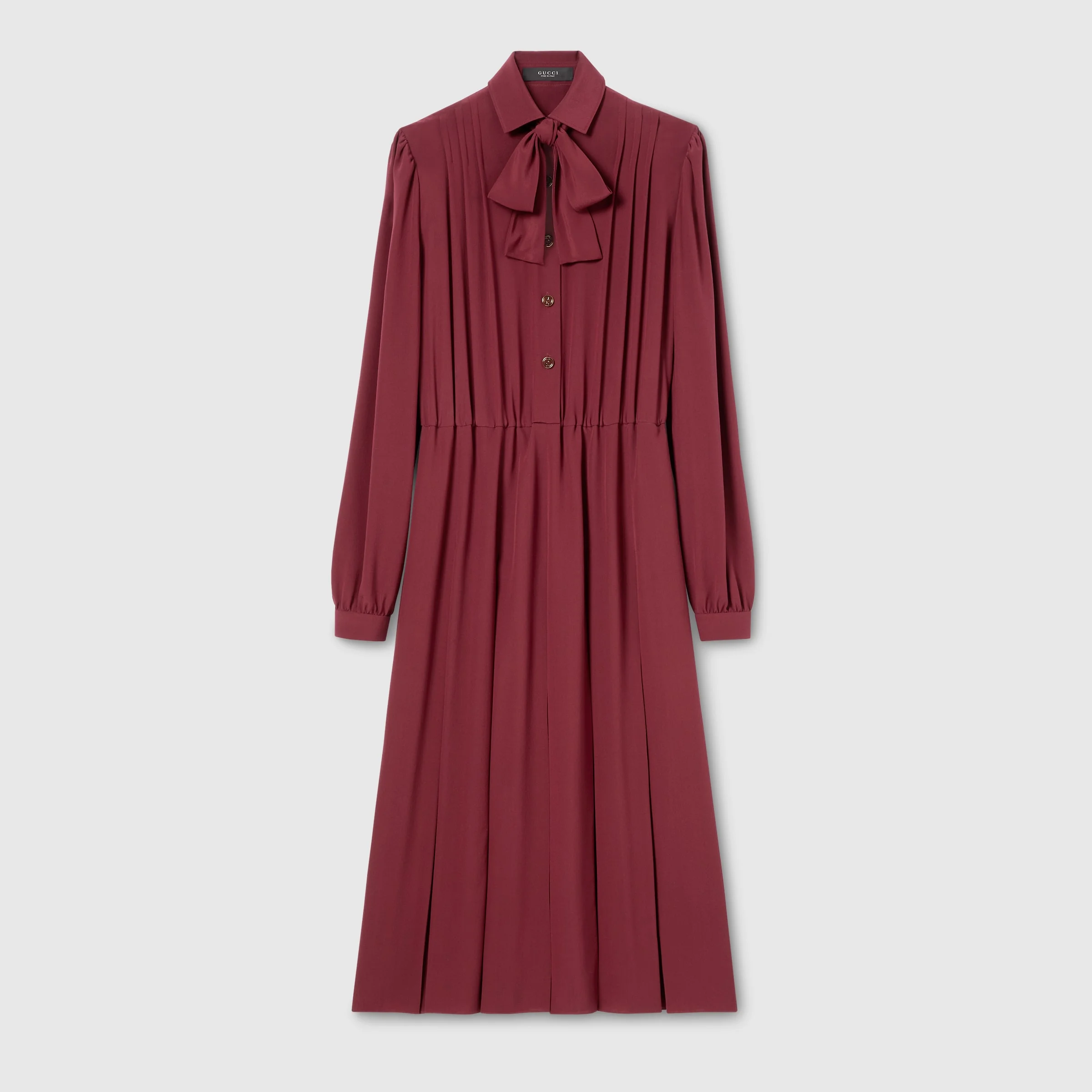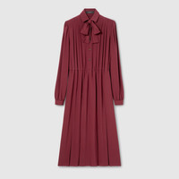 Introducing Spring Summer 2026. This style is featured as part of the "Ereditiera" look of La Famiglia, which reinterprets the House’s codes through singular personalities and distinctive aesthetic attitudes. Crafted from silk crepe de chine, this dress is defined by GG enameled buttons. - Bordeaux silk crepe de chine - GG enameled button - Self-tie bow - Pleated skirt - Long sleeves - Length: 47.6", based on a size 40(IT) - Made in Italy - Fabric: 100% Silk