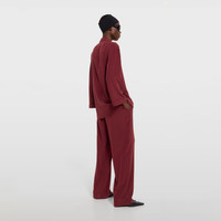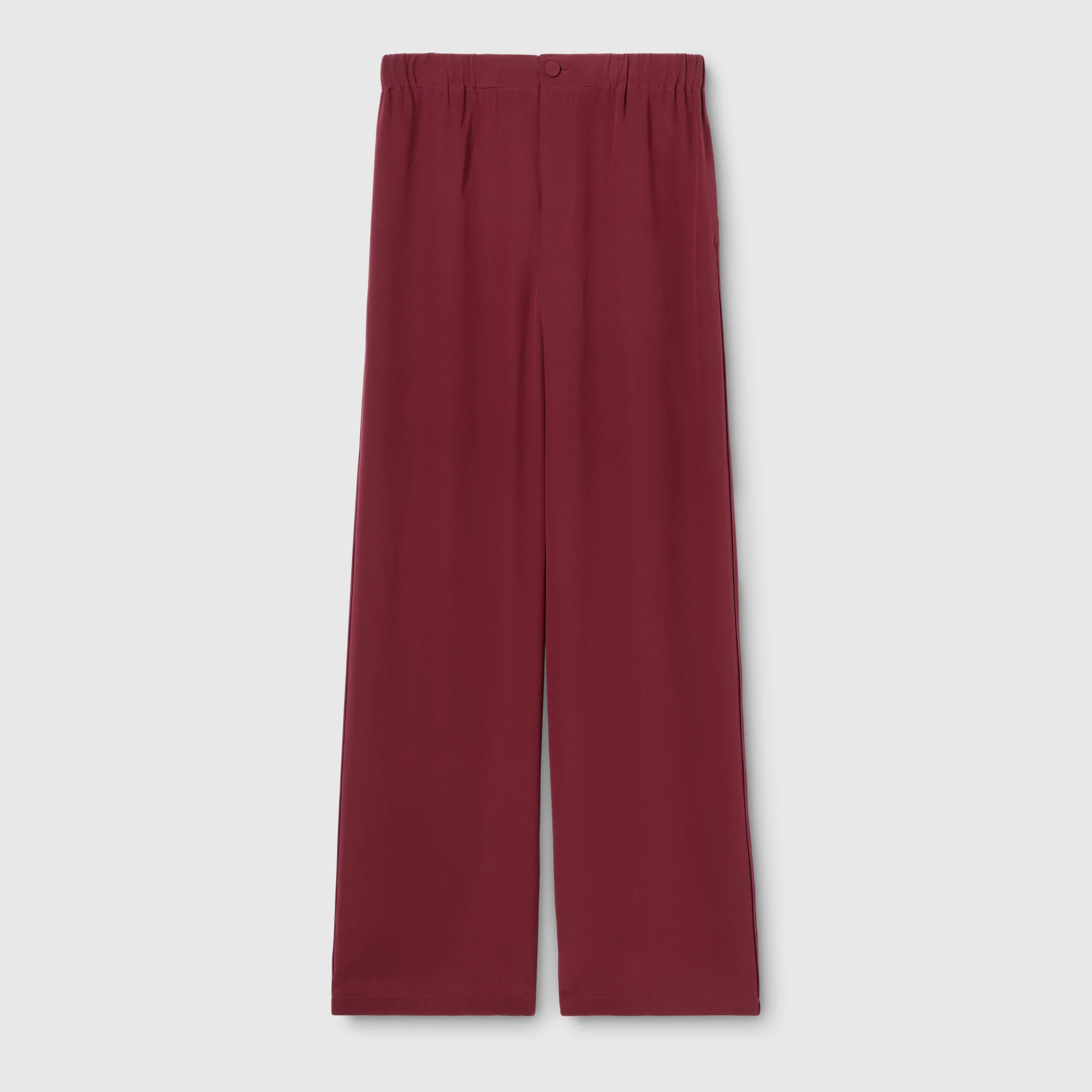 Introducing Spring Summer 2026. This style is inspired by the "Ereditiera" look of La Famiglia. The collection reinterprets the House’s codes through singular personalities and distinctive aesthetic attitudes. Crafted from silk crepe de chine, these pair of pants is enriched with a Gucci crest embroidery. - Bordeaux silk crepe de chine - Gucci crest embroidery - Piping detail - Unlined - Elastic waistband with drawstring - Back pockets - Length: 43.7"; Leg opening: 24.2", based on a size 42(IT) - Made in Italy - Fabric: 100% Silk - Embroidery: 100% Polyester