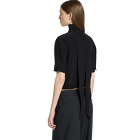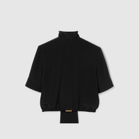 In the Fall Winter 2025 collection, this short-sleeved top is designed with a back self-tie neck bow. The style is completed by a Gucci metal detail at the waist and a covered button closure. - Black silk crepe de chine - Unlined - Ruched elastic waist with metal Gucci buckle - Floor length self-tie neck bow - Short sleeves - Covered button closure - Length: 18.3"; based on a size 38 (IT) - Made in Italy