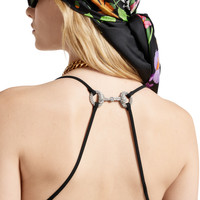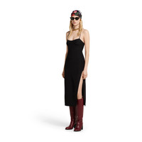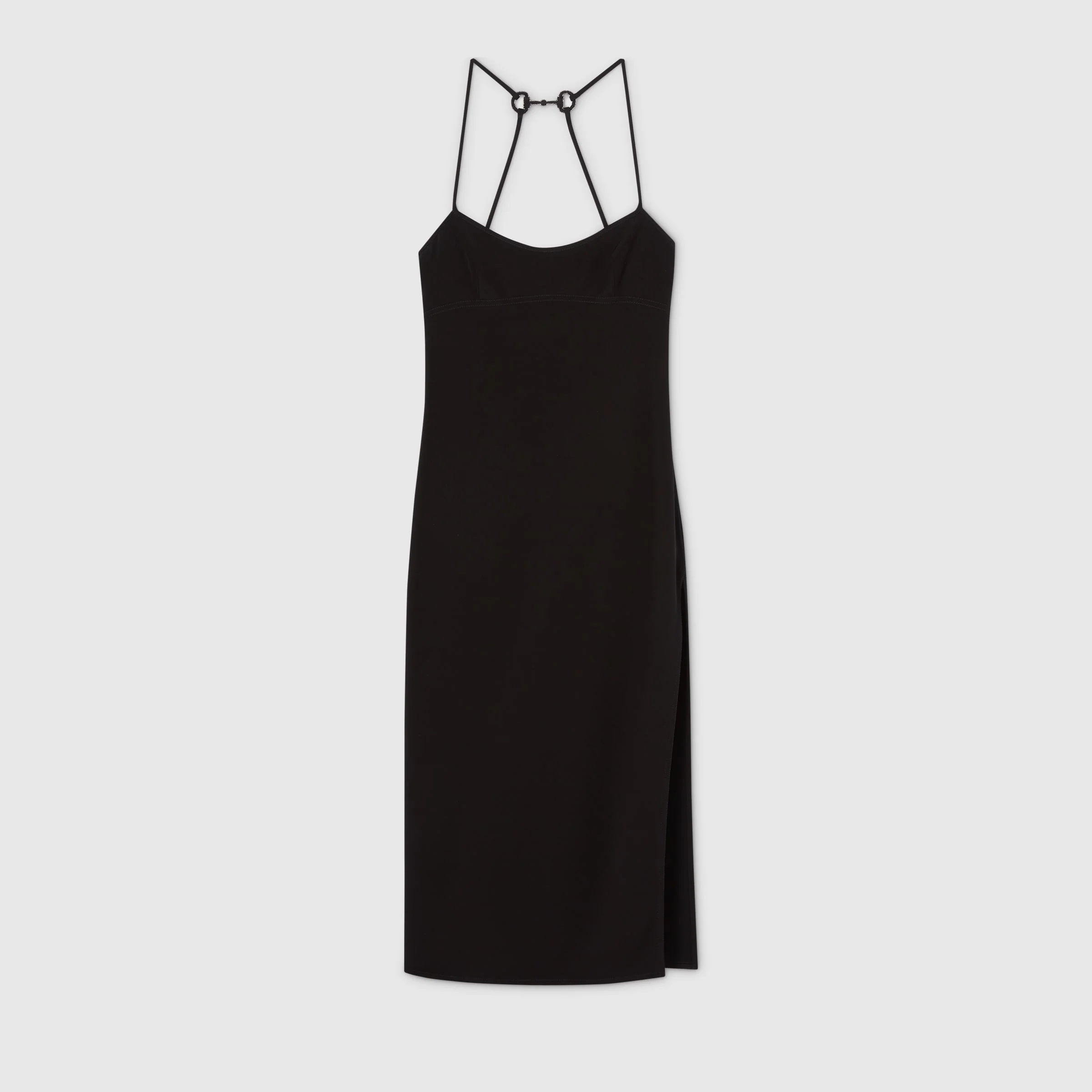 A monochrome palette with subtle details, such as embroideries or logo hardware, transitions the wardrobe from day to night in a selection of pieces from the Pre-Fall 2025 collection. This elegant viscose silk dress features a central crystal Horsebit detail at the back. - Black viscose silk - Lined - Thin shoulder straps with crystal Horsebit detail at the back - Side slit - Side zip closure - Made in Italy