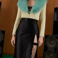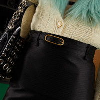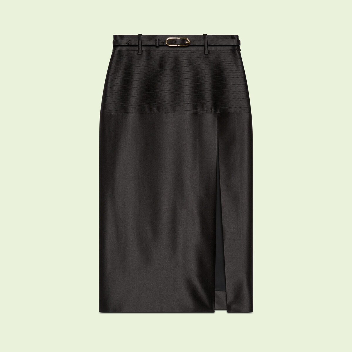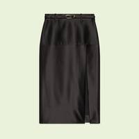 The sensual mood introduced by Gucci Aria continues with the Gucci Love Parade chapter. This black satin skirt imbues retro glamor with its mid-length and front slit. Embroidered details decorate the top part of the skirt, while a detachable tone-on-tone leather belt completes the design. - Black silk duchesse - Embroidered detail - Lined - Detachable leather self-belt with buckle - Regular waist - Front slit - Length: 27.6" based on a size 36 (IT) - Made in Italy - The product shown in this image is a size 36 (IT)