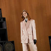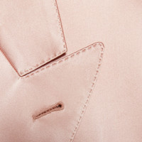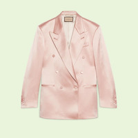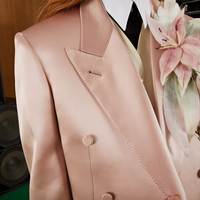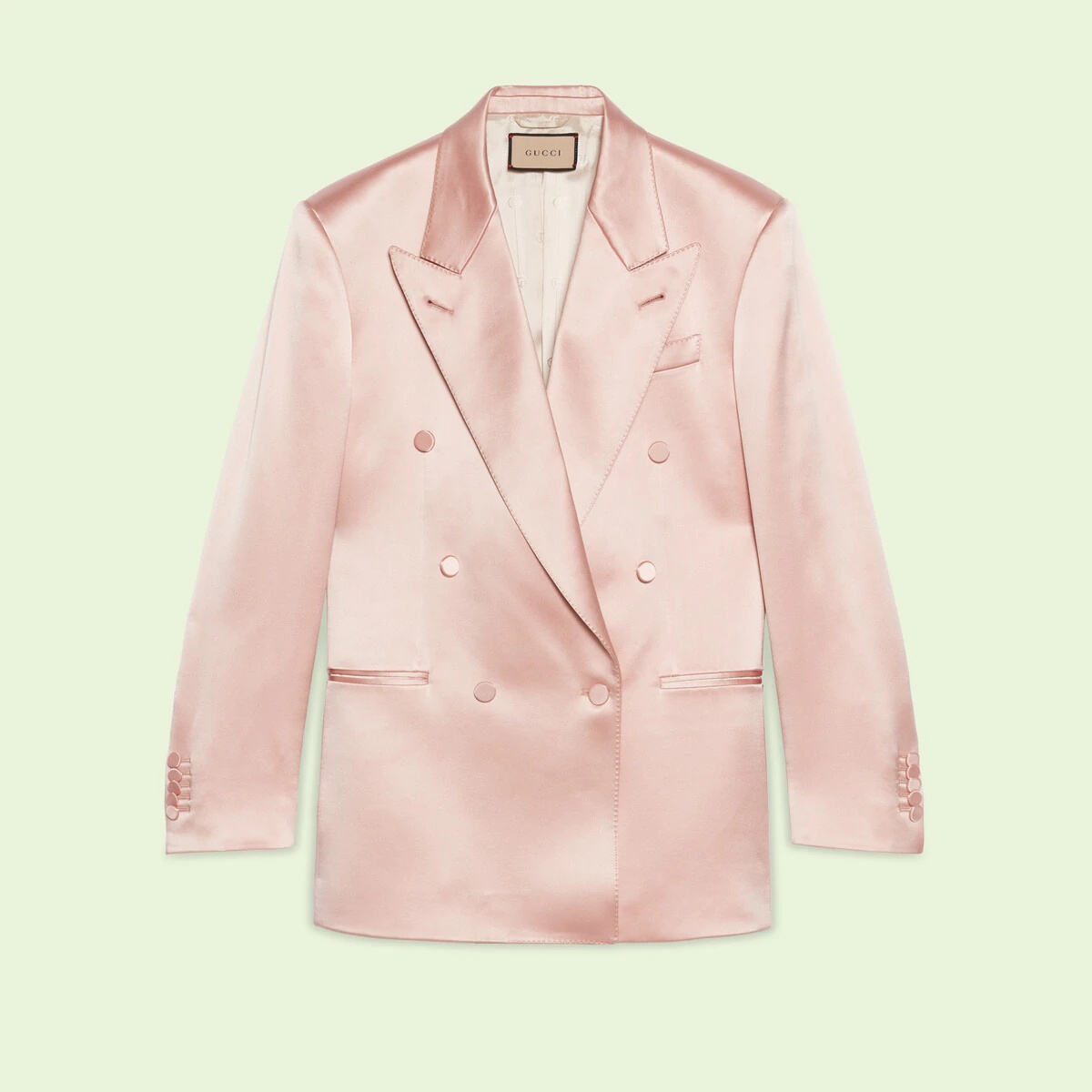 Reimagined within a refreshed aesthetic that instills a contemporary spirit in classic designs, sartorial jackets become the protagonist of mismatched looks. Crafted from light pink silk duchesse, this jacket is designed with a double-breasted construction and peak lapel. - Light pink silk duchesse - Self-covered buttons - Lined - Peak lapel - Double-breasted - Pockets and chest welt pocket - Length: 30.3", based on a size 38 (IT) - Made in Italy - The product shown in this image is a size 38 (IT)