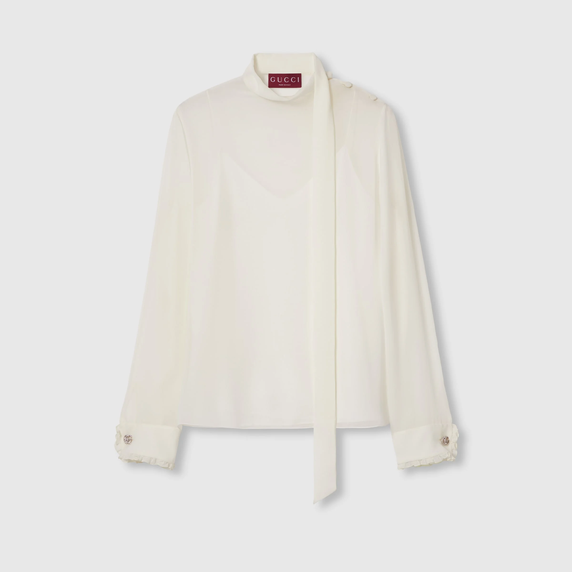 Fringes, beads, crystals and other highly artisanal details characterize Creative Director Sabato De Sarno's approach to the everyday wardrobe, expressed through inspirations and distinctive codes. This elegant top has been crafted from a light silk georgette and enriched with crystal Double G buttons. A detachable crepe de chine camisole offers increased versatility. - Ivory light silk georgette - Crystal Double G buttons - Self-covered buttons - Detachable crepe de chine camisole - Neck bow - Dropped shoulder - Long sleeves - Buttoned cuffs - Button closure - Length: 24.8"; based on a size 40 (IT) - Made in Italy - The product shown in this image is a size 40 (IT)