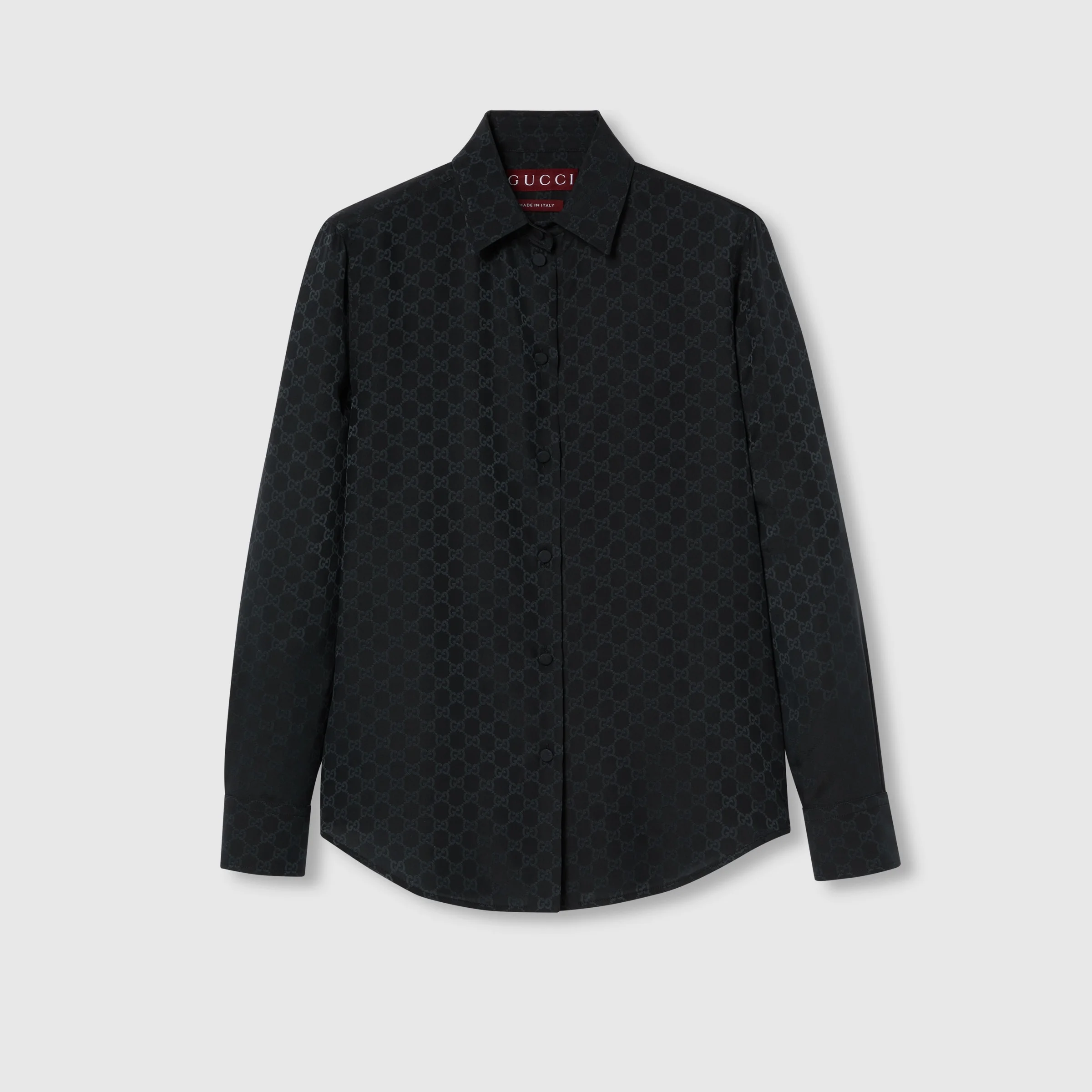 The GG motif appears in unexpected colors and fabric combinations, from linen blend to nylon. This regular fit shirt is presented in a GG crepe silk, referencing the House's instantly-recognizable monogram motif. Self-covered buttons add the finishing touch to the silhouette. - Black GG crepe silk - Self-covered buttons - Point collar - Long sleeves - Shoulder drop: 16.5 " based on a size 40 (IT) - Sleeves length: 31.4 " based on a size 40 (IT) - Neck width: 15.4 " based on a size 40 (IT) - Button closure - Regular fit - Length: 26.3 " based on a size 40 (IT) - Made in Italy - The model is 5'8" and is wearing size 40 (IT) - Fabric: 100% Silk