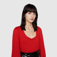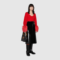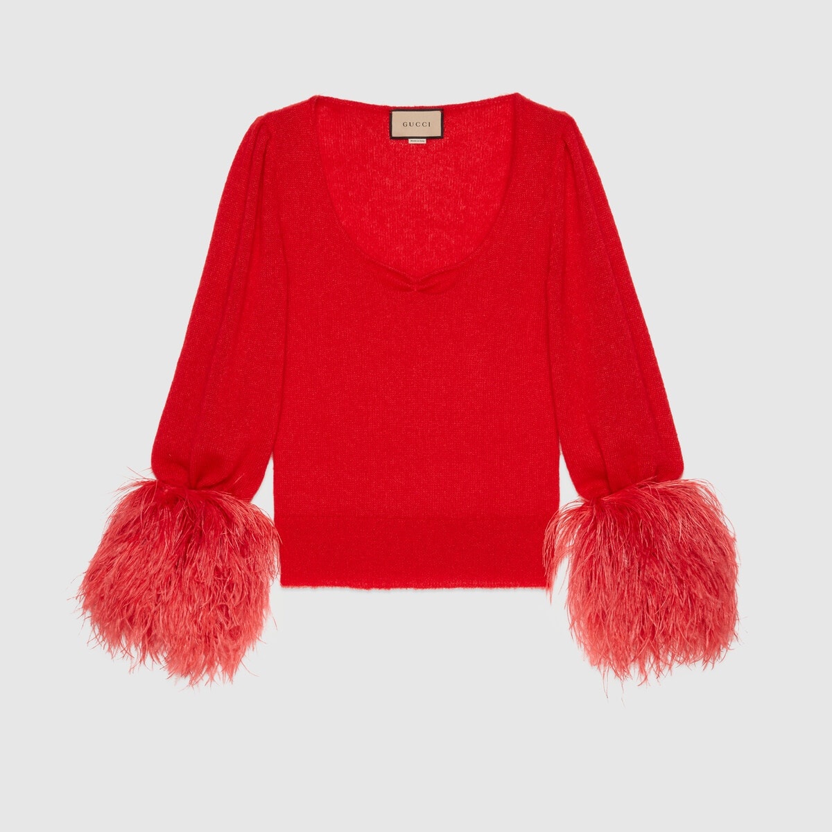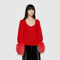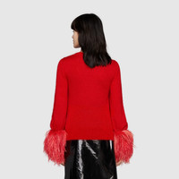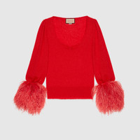Gucci Aria is an ode to both the traditional and the contemporary nature of the House. Symbols that have defined different eras appear as recognizable logos and through subtle hints to the past. The choice of feathers for this mohair silk sweater references one of the most recognizable elements used by Tom Ford for Gucci. - Red silk mohair plain stitch - Double G embroidery on the back - V-neckline - Detachable feather sleeves - Length: 24.2", based on a size small - Made in Italy - The model is 5'7" tall. The product shown in this image is a size small