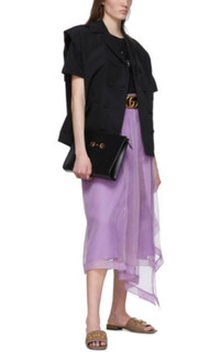 Imbued with a romantic feel, the sheer skirt gives a subtle contrast to the daring looks of the Spring Summer 2020 collection. A mix of vivid colors and transparencies, and sleek and delicate silhouettes, redefines the concept of femininity with hints to the idea of freedom that fashion experienced in the ‘90s. Crafted from pleated wisteria silk organdy, the flowing design reveals a side slit—a recurring element of this collection. - Wisteria light silk organdy - Detachable tonal crêpe underskirt with elastic waistband - Asymmetrical design - Pleated front - Front left slit, 8.5" from the waist - Side zip closure - Sits high on the waist - Length: 32" based on a size 40 (IT) - Measurements are based on a size 40 (IT) - Please note, the slit is designed to be easily altered to a lower length or closed as desired. - External fabric: 100% silk Underskirt: 73% acetate and 27% silk - Made in Italy - The model is 5'7" and is wearing size 40 (IT)