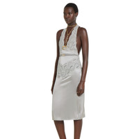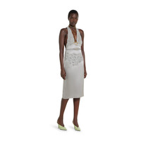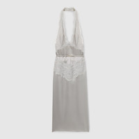In the Fall Winter 2025 collection, sensuality is redefined through precise cuts and delicate textures. This midi dress features a deep halter neckline and lace trims that contour the bodice and hips. A detachable ruched elastic belt with a metal Gucci buckle enhances the waist, while the open back completes the silhouette. - Grey silk satin - Lace trim - Halter neck - Detachable ruched elastic belt with metal Gucci buckle - Halter neckline - Midi length - Open back - Made in Italy