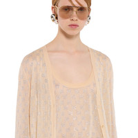 In the Cruise 2026 collection, crystal embroidery creates a sparkling contrast with the texture of emblematic fabrics of the House. Crafted from fine silk, this tank top is enriched with allover GG crystals. - Light pink fine silk - Rib trim - Allover GG crystals - Scoop neck - Sleeveless - Length: 27.1" based on a size XS - Made in Italy - Fabric: 100% Silk - Non textile application: 100% Glass